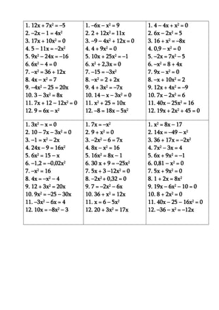 The document contains 144 examples of quadratic equations arranged in 12 sections with 12 examples each. The examples include single variable quadratic equations with real number coefficients that can be solved using techniques like factoring, completing the square, and using the quadratic formula. Overall the document provides a large collection of example problems working with quadratic equations.