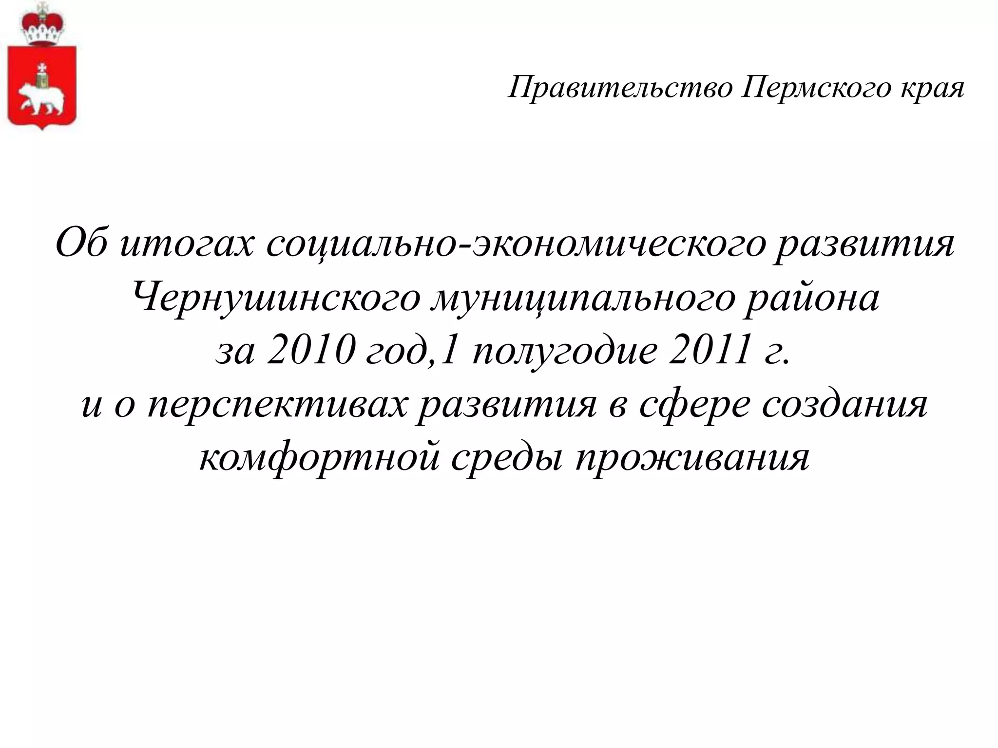 Документ предоставляет анализ социально-экономического развития Чернушинского района Пермского края за 2010 год и первое полугодие 2011 года. В нем освещаются такие аспекты, как выполнение показателей реформирования жилищно-коммунального хозяйства, тарифы на коммунальные услуги и доступность сотовой связи и интернета. Также представлены данные о дорожно-транспортных происшествиях и их причинах на территории района.