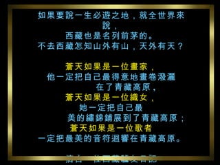 蒼天如果是一位畫家, 他一定把自己最得意地畫卷潑灑 在了青藏 高原 , 蒼天如果是一位織女, 她一定把自己最 美的繡錦鋪展到了青藏高原; 蒼天如果是一位歌者 一定把最美的音符迴響在青藏高原。 - 摘自一位西藏驢友日記 -