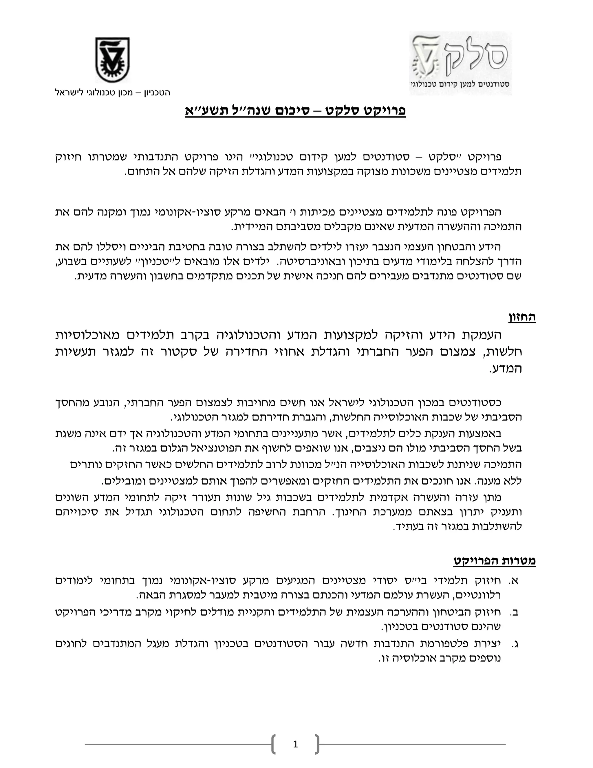 פרויקט "סלקט – סטודנטים למען קידום טכנולוגי" הינו פרויקט התנדבותי שמטרתו חיזוק