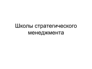 Документ описывает различные школы стратегического менеджмента, включая школы дизайна, планирования, позиционирования, предпринимательства, обучения, власти, культуры, внешней среды и конфигурации. Каждая школа представляет уникальные подходы к формированию и реализации стратегий, обнаруживая их достоинства и недостатки, а также принципы, лежащие в основе стратегического процесса. В итоге, документ подчеркивает важность адаптации стратегий к изменениям внутри организации и внешней среды.