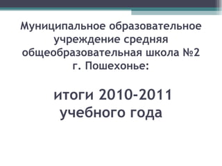Документ представляет собой отчет о деятельности муниципального образовательного учреждения, средней общеобразовательной школы №2 города Пошехонья за 2010-2011 учебный год. В нем изложены приоритетные направления работы, информация о контингенте обучающихся, кадровом составе, результатах научных конкурсов и Олимпиад, а также данные по успеваемости и здоровью школьников. Отчет подчеркивает значимость патриотического воспитания и развития ключевых компетентностей у обучающихся.