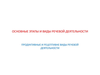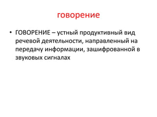 Документ описывает основные этапы и виды речевой деятельности, включая продуктивные и рецептивные виды. Говорение рассматривается как устный продуктивный вид речевой деятельности, ориентированный на передачу информации через звуковые сигналы. Основное внимание уделяется важности говорения в коммуникации.