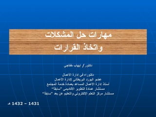 مهارات حل المشكلات واتخاذ القرارات دكتور /  إيهاب خفاجي دكتوراه في إدارة الأعمال عضو البورد البريطاني لإدارة الأعمال أستاذ إدارة الأعمال المساعد   بعمادة خدمة المجتمع مستشار عمادة التطوير الأكاديمي ”سابقاً“ مستشار مركز التعلم الإلكتروني والتعليم عن بعد ”سابقاً“ 1431 – 1432  هـ