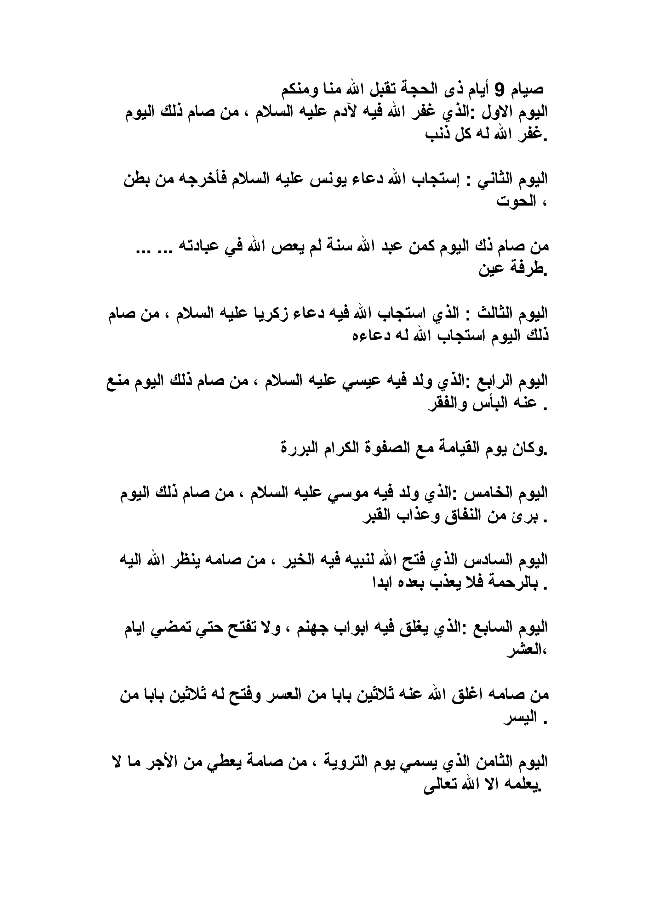 تناقش الوثيقة فضائل أيام صيام معينة في الإسلام، حيث يُشير النص إلى أن كل يوم من هذه الأيام يرتبط بدعوات مستجابة لبعض الأنبياء ويجلب الرحمة والمغفرة للذنوب. كما تتطرق الوثيقة إلى أهمية الصيام في التأكيد على الفضل الخاص لكل يوم وكيف أنه يُسهم في تكفير الخطايا.