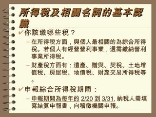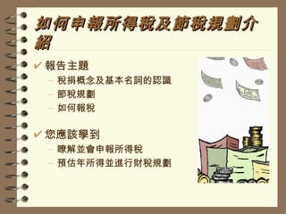 本文件介绍了所得税的申报和节税规划,包括对基本税务名词的认识、所得税的申报时限以及需要缴纳的各种税种。文中详细阐述了夫妻如何进行合并或分开报税的优势,并介绍了多种节税策略,例如利用免税额、正式扣除和特别扣除等方式。最后,概述了关于财产交易所得的计算方法及注意事项。