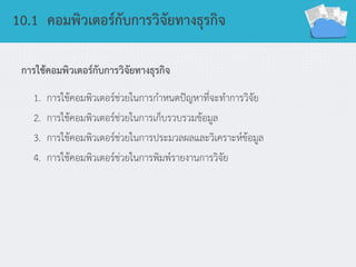 10.1 คอมพิวเตอร์กับการวิจัยทางธุรกิจ การใช้คอมพิวเตอร์กับการวิจัยทางธุรกิจ 1. การใช้คอมพิวเตอร์ช่วยในการกาหนดปัญหาที่จะทาการวิจัย 2.