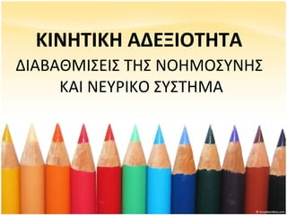 ΝΕΥΡΙΚΟ ΣΥΣΤΗΜΑ Στονκινητικό μηχανισμό συμπεριλαμβάνονται: το πυραμιδικό σύστημα ή σύστημα του κεντρικού κινητικού νευρώνα, το σύστημα του περιφερικού κινητικού νευρώνα και το εξωπυραμιδικό σύστημα . Οι μηχανισμοί αυτοί είναι υπεύθυνοι για τις εκούσιες κινήσεις. Το εξωπυραμιδικό σύστημα ελέγχει επίσης και την ακούσια αυτόματη κινητικότητα. Στο μηχανισμό αυτό επεμβαίνουν μηχανισμοί για την εναρμόνιση των κινήσεων και τη διατήρηση της ισορροπίας στη στάση και τη βάδιση( νοτιαίος ρυθμιστικός μηχανισμός και παρεγκεφαλίδα).