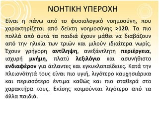 ΝΟΗΤΙΚΗ ΥΠΕΡΟΧΗ Είναιη πάνω από το φυσιολογικό νοημοσύνη, που χαρακτηρίζεται από δείκτη νοημοσύνης >120 . Τα πιο πολλά από αυτά τα παιδιά έχουν μάθει να διαβάζουν από την ηλικία των τριών και μιλούν ιδιαίτερα νωρίς. Έχουν γρήγορη αντίληψη , ανεξάντλητη περιέργεια , ισχυρή μνήμη , πλατύ λεξιλόγιο και ασυνήθιστο ενδιαφέρον για άτλαντες και εγκυκλοπαίδειες. Κατά την πλειονότητά τους είναι πιο υγιή, λιγότερο καυχησιάρικα και περισσότερο έντιμα καθώς και πιο σταθερά στο χαρακτήρα τους. Επίσης κοιμούνται λιγότερο από τα άλλα παιδιά.