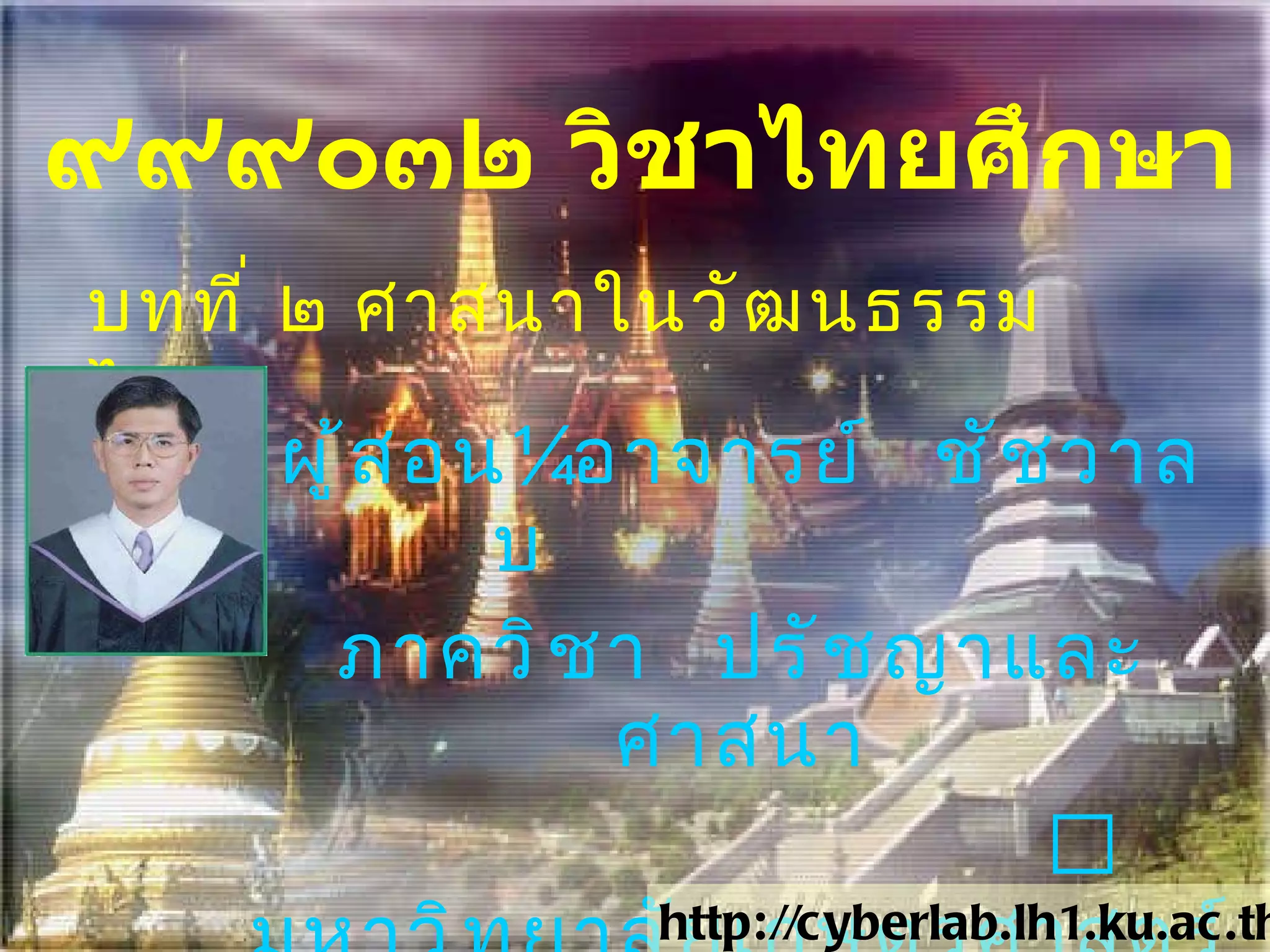 บทที่๒ศาสนาในวัฒนธรรมไทย ๒ .๑ ความนำ : วัฒนธรรม ๒ . ๒ พระพุทธศาสนาในวัฒนธรรมไทย ๒ . ๓ ศาสนาพราหมณ์ในวัฒนธรรมไทย ๒ . ๔ ศาสนาคริสต์ในวัฒนธรรมไทย ๒ . ๕ ศาสนาอิสลามในวัฒนธรรมไทย ๒ . ๖ ศาสนาอื่น ๆ ในวัฒนธรรมไทย - 4.