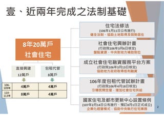本文介绍了台湾内政部在社会住宅政策方面的进展和措施,包括立法修正、融资平台和包租代管计划。未来计划在八年内建造12万户社会住宅,强调通过长期融资与中央补贴来支持项目执行。文档也提到目前已建和在建的住宅数量,以及如何吸引更多的参与者和增强市场成熟度。