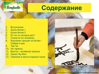 Документ описывает китайскую кухню, подчеркивая разнообразие ее региональных направлений, включая особенности блюд и ингредиентов, характерных для каждого региона. Он также акцентирует внимание на традиционных методах приготовления и философии еды, которая включает баланс вкусов для поддержания здоровья. В дополнение представлены рецепты известных китайских блюд, таких как вонтон и свинина в кисло-сладком соусе.