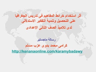 تناقش الدراسة أثر استخدام خرائط المفاهيم في تدريس مادة الجغرافيا على تحصيل التفكير الاستدلالي لتلاميذ الصف الثاني الإعدادي. أظهرت النتائج أن استخدام خرائط المفاهيم يعزز من متوسط درجات التحصيل والتفكير الاستدلالي مقارنةً بالطريقة التقليدية. يقدم البحث توصيات لتطوير استراتيجيات التعليم في الجغرافيا من خلال دمج أسلوب خرائط المفاهيم.