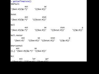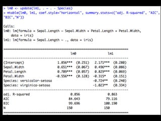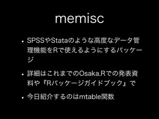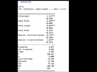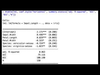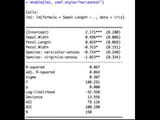 The document describes the memisc R package which contains functions for creating publication-ready regression tables. It shows how to use the mtable function to generate a regression table from linear models and export it to an Excel spreadsheet. Additionally, it demonstrates how to write the iris dataset directly to a worksheet and a subset of iris to another location in the same worksheet.