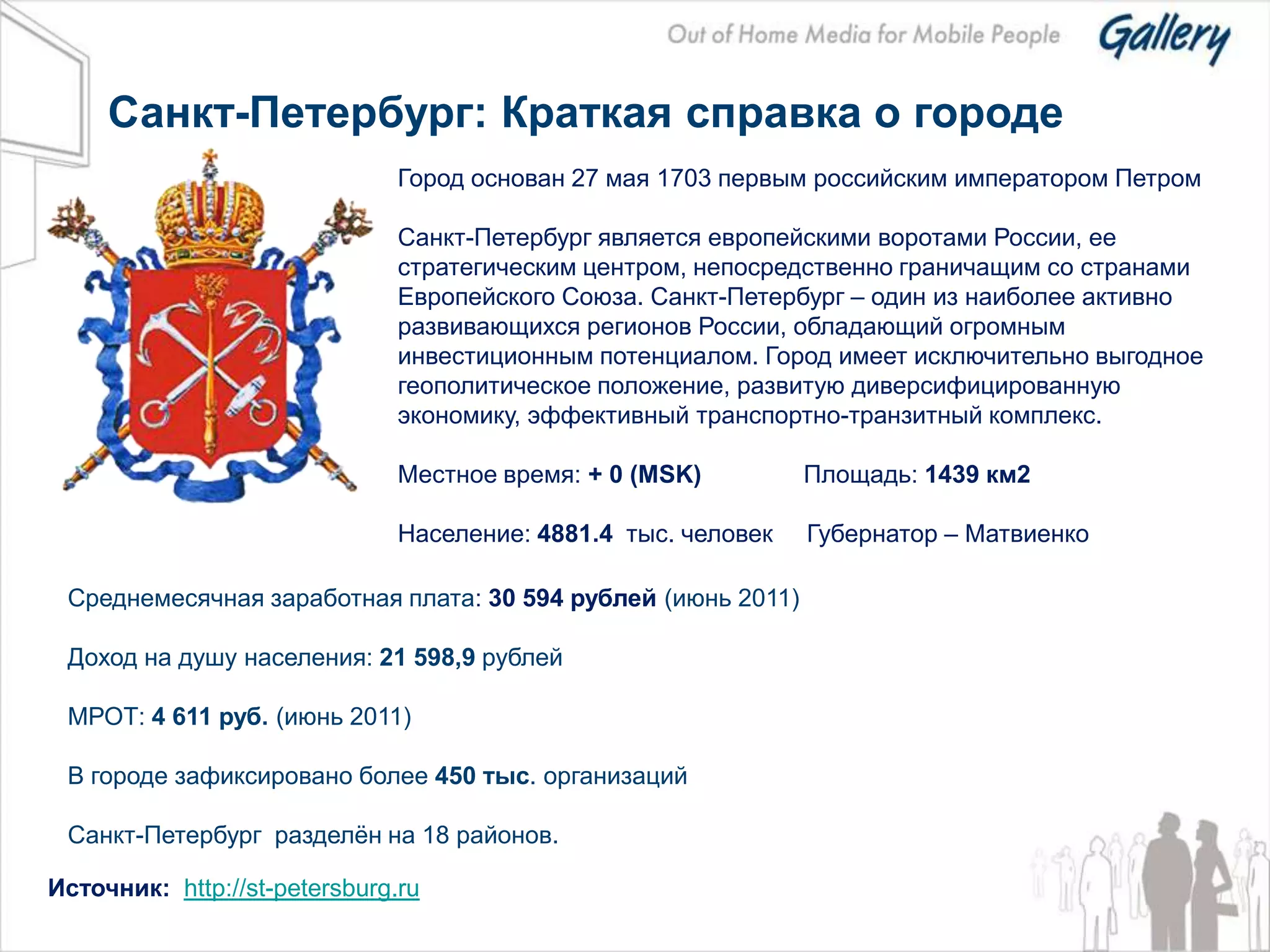 Документ представляет обзор регионального рынка наружной рекламы в Санкт-Петербурге за 2011 год, подчеркивая экономический потенциал и геополитическое положение города. Также обсуждаются ключевые игроки на рынке, объем затрат и статистика по различным секторам рекламы, с акцентом на самые крупные рекламные компании и их доли на рынке. В результате, рынок наружной рекламы показал рост на 31% по сравнению с предыдущим годом, что указывает на его положительную динамику.