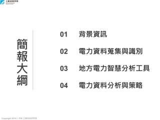 本文件介绍了工研院在地方能源治理方面的努力,包括电力信息识别和策略链结的全方位协助。通过收集和分析电力数据,以及使用智能分析工具,支持地方政府制定能源策略和行动计划。文件还探讨了国家能源供需现状和再生能源发展的前景。