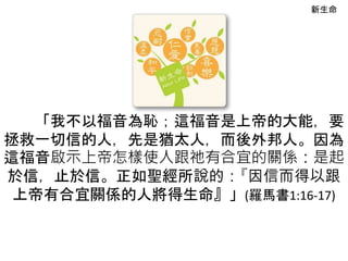 新生命 「我不以福音為恥;這福音是上帝的大能,要 拯救一切信的人,先是猶太人,而後外邦人。因為 這福音啟示上帝怎樣使人跟祂有合宜的關係:是起 於信,止於信。正如聖經所說的:『因信而得以跟 上帝有合宜關係的人將得生命』」(羅馬書1:16-17)
