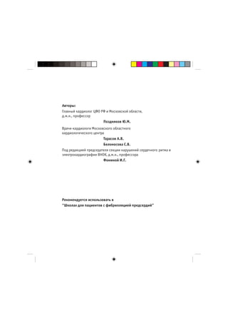 Документ содержит памятку для пациентов с фибрилляцией предсердий, излагая основные аспекты анатомии и физиологии сердца, а также его ролей в кровообращении. Обсуждаются причины возникновения и симптомы этого состояния, его классификация и проявления. Уделяется внимание особенностям диагностики и необходимости обращения за медицинской помощью при тяжелых проявлениях аритмии.