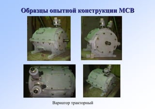 Документ описывает механические силовые вариаторы нового поколения, которые обеспечивают плавное регулирование мощности и могут значительно улучшить надежность и эффективность работы различных машин, включая тракторы и комбинированные устройства. Основные преимущества вариаторов включают высокий КПД, долговечность, снижение затрат на материалы и энергией, а также уменьшение металлической емкости приводов. Сравнения с другими типами вариаторов показывают, что МСВ позволяет работать эффективно в широком диапазоне угловых скоростей с высокой производительностью.
