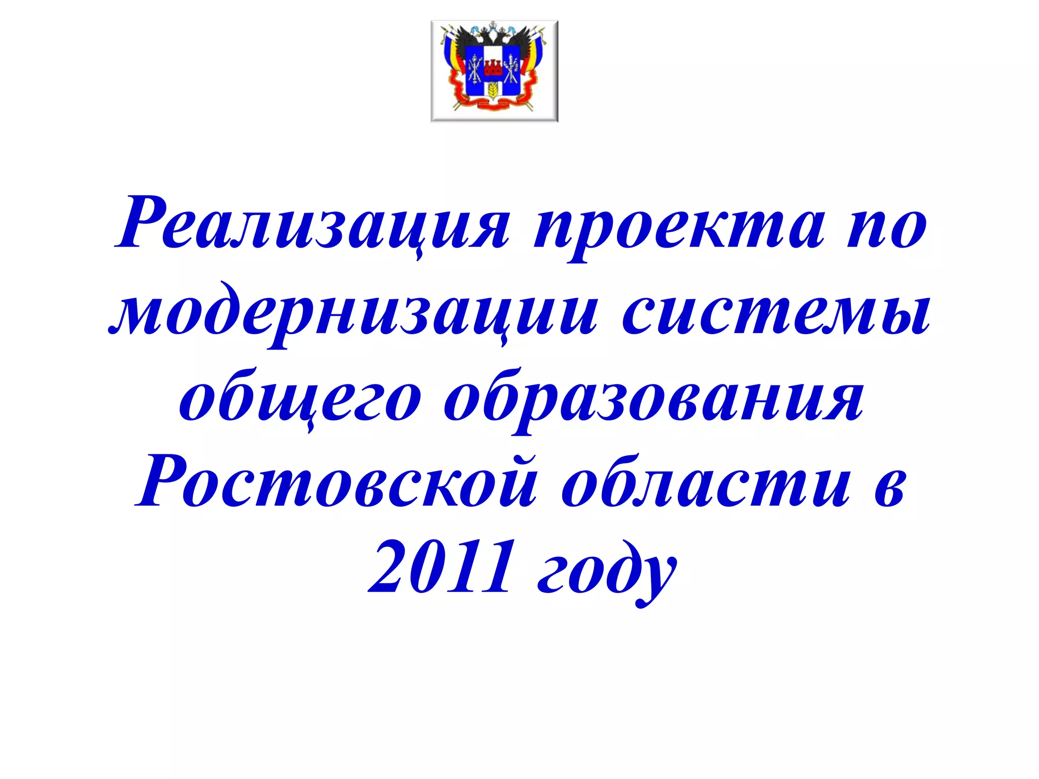 Документ описывает реализацию проекта модернизации системы общего образования Ростовской области в 2011 году, включающего финансирование в размере 120 млрд. руб. на 2011-2013 годы. Основные направления проекта включают приобретение оборудования, транспортных средств, учебников, развитие инфраструктуры и повышение квалификации учителей. Ожидаемые результаты включают улучшение заработной платы учителей, оснащение школ компьютерами и школьными автобусами, а также предоставление широкополосного интернета в 100% школ.
