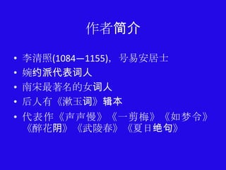 李清照是南宋著名的婉约派女词人,其代表作《声声慢》反映了她在国家动乱和个人丧失中的孤寂与悲凉情感。该词作风格深沉凝重,与她早期作品形成鲜明对比,描绘了残秋的景象与复杂的心情。李清照的文学才能在宋代词人中独树一帜,影响深远。