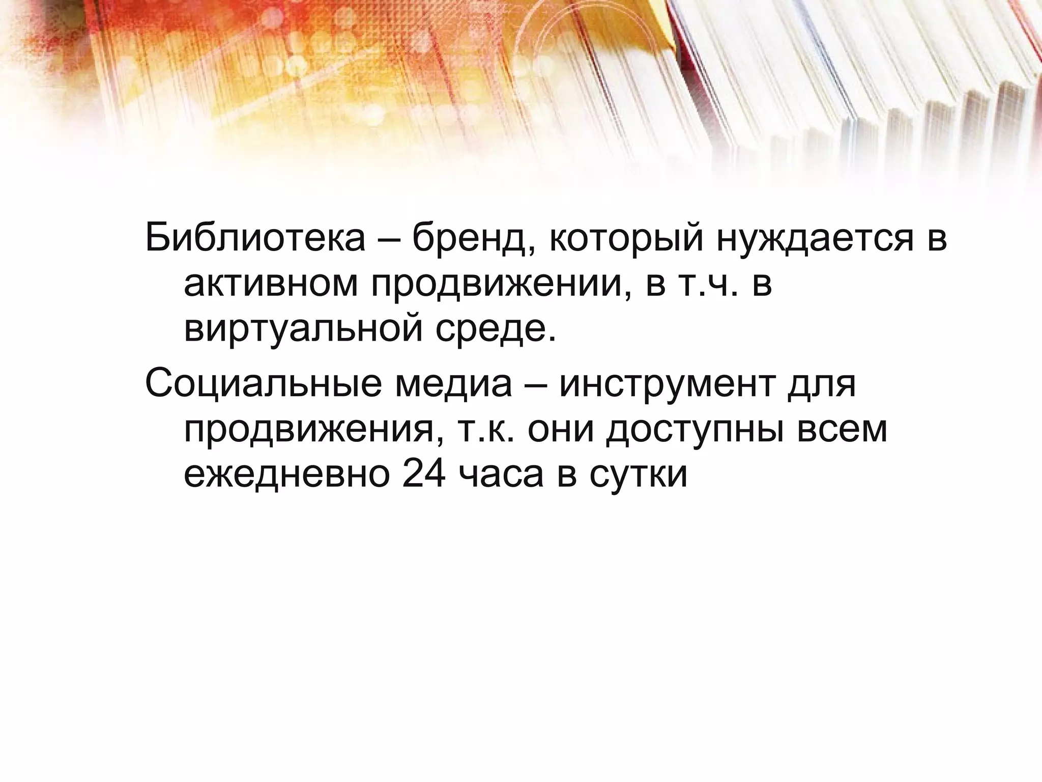 Документ рассматривает стратегию продвижения библиотеки через социальные медиа, включая платформы такие как Twitter, Facebook и ВКонтакте. Он предлагает рекомендации по созданию активной группы, вовлечению пользователей и обмену контентом, а также важность взаимодействия с читателями. Автор подчеркивает необходимость уникального контента и способов привлечения новых участников через конкурсы и личные обращения.