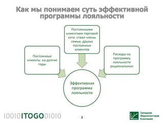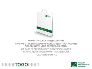 Документ представляет коммерческое предложение по разработке и внедрению программы лояльности для торговых сетей, основанной на программном обеспечении itogo!retailsuite 4.0. Он описывает этапы создания эффективной программы, включая анализ маркетинговой среды, создание рабочих концепций, расчет показателей эффективности и тестирование, а также предоставляет информацию о сроках выполнения и стоимости каждого этапа. В результате торговая сеть сможет улучшить отношения с клиентами, увеличить продажи и сегментировать покупателей.