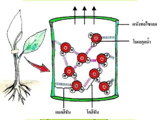 4. กลไกการลำเลียงน้ำของพืช กลไกที่พืชใช้ในการลำเลียงน้ำจากรากไปยังส่วนต่าง ๆ เช่น แรงดันราก (Root pressure) แรงดึงจากการคายน้ำ (Transpiration pull) เป็นต้น - 10.