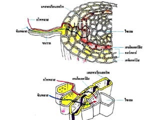 2. โครงสร้างที่ทำหน้าที่ในการลำเลียงน้ำการที่น้ำและแร่ธาตุที่รากดูดซึมจากดินจะผ่านเซลล์ชั้นนอกคือ เอพิเดอร์มิส เข้าสู่เซลล์ชั้นใน คือ คอร์เทกซ์ เอนโดเดอร์มิส และ ไซเลมของราก โดยอาศัย การลำเลียงทางด้านข้าง (Lateral transport) โดย มี 2 วิธี 2.1 อะโพพลาสต์ (Apoplast) 2.2 ซิมพลาสต์ (Simplast) - 5.