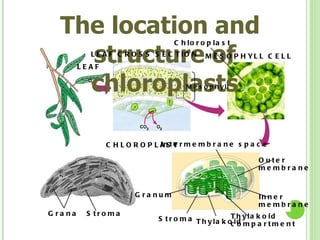 The location andstructure of chloroplasts LEAF CROSS SECTION MESOPHYLL CELL LEAF Chloroplast Mesophyll CHLOROPLAST Intermembrane space Outer membrane Inner membrane Thylakoid compartment Thylakoid Stroma Granum Stroma Grana