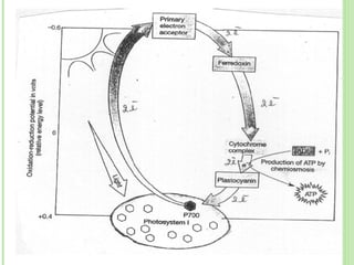 การถ่ายทอด อิเล็กตรอนแบบเป็นวัฏจักร Cyclicor linear electron flow เกิดที่ PSI โดยพลังงานแสงที่กลุ่มรงควัตถุดูดซับไว้ ถูกส่งผ่านไปยัง P700 ซึ่งเป็นศูนย์กลางปฏิกิริยา ทำให้โมเลกุลของ P700 ถูกกระตุ้นจึงปล่อย e - ให้กับโมเลกุลของสารที่เป็นตัวรับ e - ตัวแรก จากนั้น e - จะถูกถ่ายทอดต่อไปยังตัวรับ e - ลำดับถัดไป