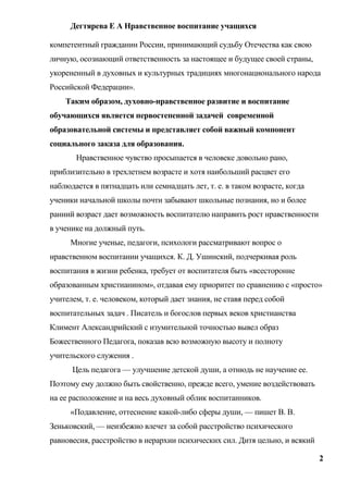 Документ посвящен нравственному воспитанию учащихся на уроках иностранного языка и подчеркивает важность духовно-нравственного развития личности. Он акцентирует внимание на необходимости формирования высоконравственных и ответственных граждан, а также описывает различные методы и подходы к воспитанию через изучение языков. Обсуждаются ключевые аспекты общения, межкультурной компетенции и влияние литературы на нравственное воспитание.