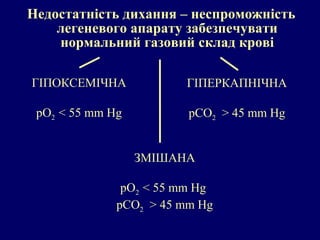 Недостатність дихання –неспроможність легеневого апарату забезпечувати нормальний газовий склад крові ГІПОКСЕМІЧНА рО 2 < 55 mm Hg ГІПЕРКАПНІЧНА р C О 2 > 45 mm Hg ЗМІШАНА рО 2 < 55 mm Hg р C О 2 > 45 mm Hg