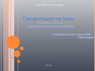 Документ описывает жизнь и ранние годы Александра Сергеевича Пушкина, начиная с его рождения в 1799 году в Москве и воспитания в семье. Он учился в царскосельском лицее, где начал писать стихи и развивать свои творческие способности. В конце текста упоминается его трагическая гибель на дуэли в 37 лет, но наследие его поэзии продолжается.