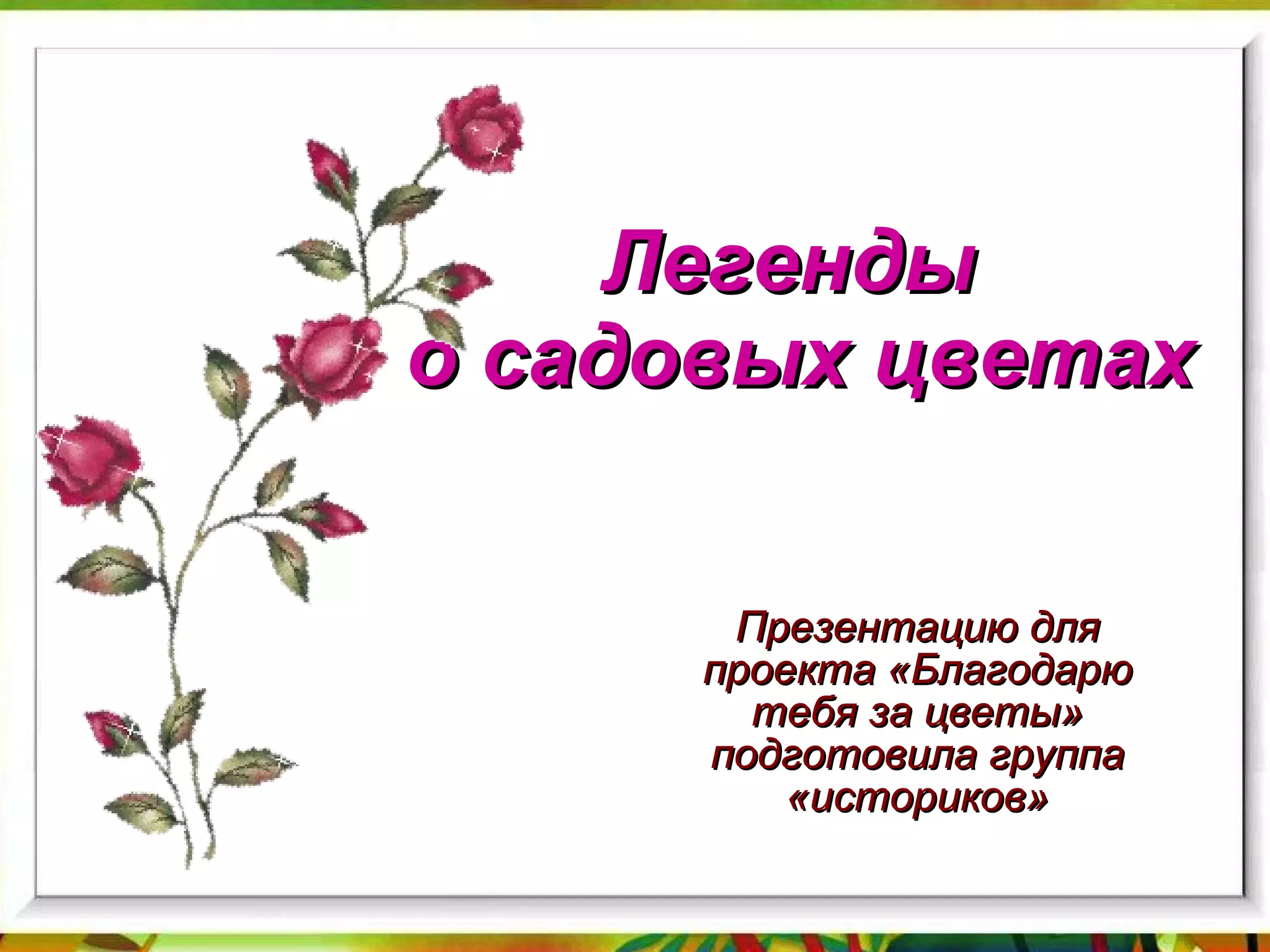 Документ представляет собой презентацию о легендах, связанных с садовыми цветами, подготовленную группой 'историков' для проекта 'благодарю тебя за цветы'. В нем описываются мифы и предания о различных цветах, их символике и роли в культуре, в том числе о розах, лилиях, хризантемах и других цветах, каждая из которых имеет свою уникальную историю. Легенды подчеркивают связь цветов с человеческими эмоциями, божественными сущностями и событиями из древности.