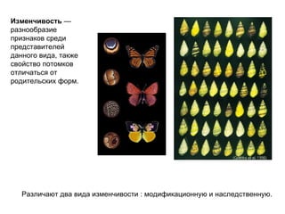 Документ описывает изменчивость как разнообразие признаков между организмами одного вида и делит ее на модификационную и наследственную. Модификационная изменчивость связана с адаптацией к окружающей среде и не затрагивает генотип, в то время как наследственная изменчивость происходит из мутаций и их комбинаций. Основные причины наследственной изменчивости включают независимое расхождение хромосом, случайное сочетание хромосом и рекомбинацию генов.