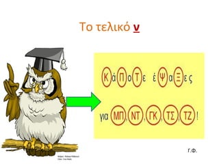 Το τελικό ν 1. 2. Ποιες λέξεις διατηρούν ή χάνουν το τελικό ν; Μερικές λέξεις άλλοτε διατηρούν το τελικό ν και άλλοτε όχι. Οι λέξεις αυτές είναι οι εξής: Τα άρθρα το(ν), τη(ν), ,ένα(ν), στο(ν), στη(ν) Το αριθμητικό ένα(ν) Η προσωπική αντωνυμία αυτή(ν) – τη(ν) Οι άκλιτες λέξεις δε(ν), μη(ν) 3. Πότε διατηρούν το τελικό ν οι παραπάνω λέξεις; Οι παραπάνω λέξεις διατηρούν το τελικό ν, όταν η ακόλουθη λέξη αρχίζει από: Φωνήεν ( α, ε, η, ι, ο, υ, ω ) Π.χ. τον ά νθρωπο, την ο δό, στον ο υρανό Τα σύμφωνα κ, π, τ και ξ, ψ ( κ ά π ο τ ε ψ ά ξ ε ) Π.χ. έναν κ ύριο, στην π λατεία, τον τ οίχο, δεν ξ έρω, τον ψ αρά Τα δίψηφα σύμφωνα μπ, ντ, γκ, τσ, τζ Π.χ. δεν μπ ορώ, μην ντ ρέπεσαι Θυμήσου τη φράση 4. Πότε χάνουν το τελικό ν οι παραπάνω λέξεις; Οι παραπάνω λέξεις χάνουν το τελικό ν όταν η λέξη που ακολουθεί, αρχίζει από τα σύμφωνα : β, γ , δ, ζ , θ, λ , μ, ν , ρ, σ , φ, χ Π.χ. τη β άρκα, μη χ αίρεσαι 5. Ποιες λέξεις διατηρούν πάντα το τελικό ν; Διατηρούν πάντα το τελικό ν: Το επίρρημα σαν π.χ. σαν αλεπού, σαν ζαρκάδι Η προσωπική αντωνυμία αυτόν – τον π.χ. αυτόν θέλω, τον γνωρίζω Η αόριστη αντωνυμία έναν π.χ. Γνώρισα κάποτε έναν μ’ αυτό το όνομα.