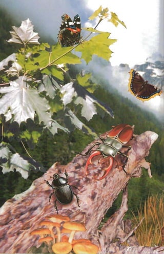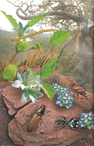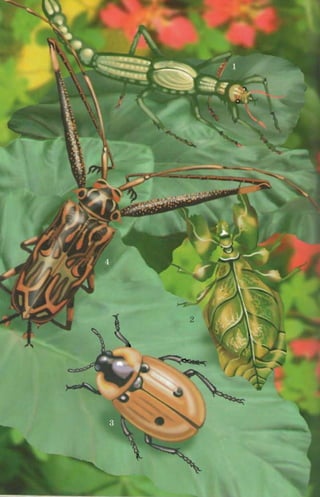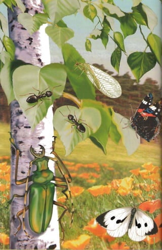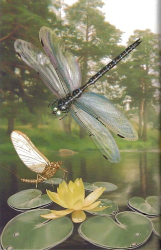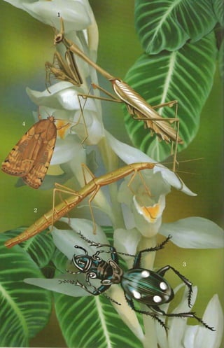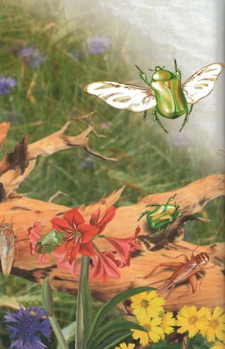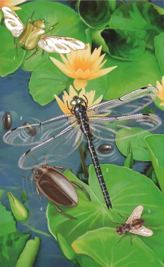 This document provides an introduction to insects by describing some of their key characteristics and adaptations that have enabled their success. It notes that insects were one of the first living creatures to inhabit Earth and have since diversified into over 1 million known species. Their small size allows insects to be highly mobile and agile while requiring minimal energy. Their hard exoskeleton, temperature regulation abilities, and other adaptations make insects well-suited to survive across various environments on Earth. The document then encourages hands-on examination of common insects like dragonflies and beetles to observe these traits firsthand.