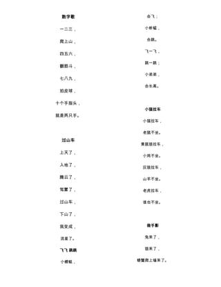会飞; 一二三, 小蚱蜢, 爬上山, 会跳。 飞一飞, 四五六, 跳一跳; 翻筋斗, 小弟弟, 七八九, 会长高。 拍皮球, 十个手指头, 小猫拉车 就是两只手。 小猫拉车, 老鼠不坐。 过山车 黄鼠狼拉车, 上天了, 小鸡不坐。 入地了, 灰狼拉车, 腾云了, 山羊不坐。 驾雾了, 老虎拉车, 过山车, 谁也不坐。 下山了, 我变成, 做手影 流星了。 兔来了, 飞飞 跳跳 狼来了, 小蜻蜓, 螃蟹爬上墙来了。