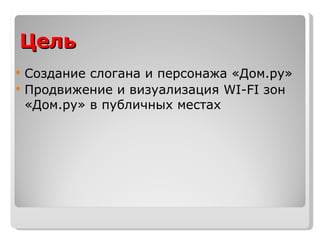 Документ описывает проект команды 'дом.ру', целью которого является создание слогана и персонажа для продвижения wi-fi зон в общественных местах. Разработан слоган 'С нами есть, чем заняться' и выбрано изображение кенгуру как уникального и скорого в производстве персонажа. Также предложены способы использования персонажа и слогана в наружной рекламе и на столах в кафе для привлечения внимания к услугам компании.
