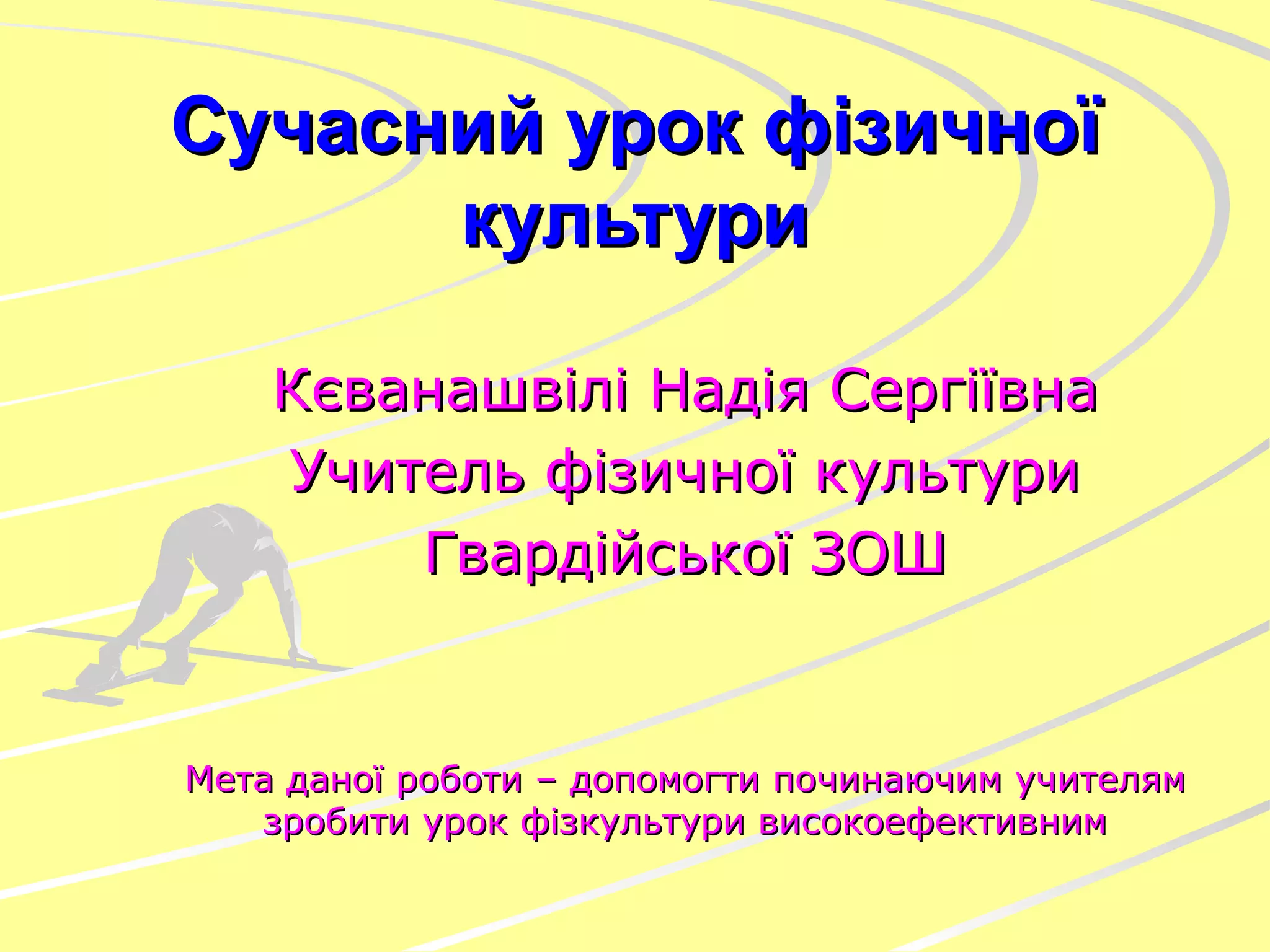 Сучасний урок фізичноїкультури Кєванашвілі Надія Сергіївна Учитель фізичної культури Гвардійської ЗОШ Мета даної роботи – допомогти починаючим учителям зробити урок фізкультури високоефективним