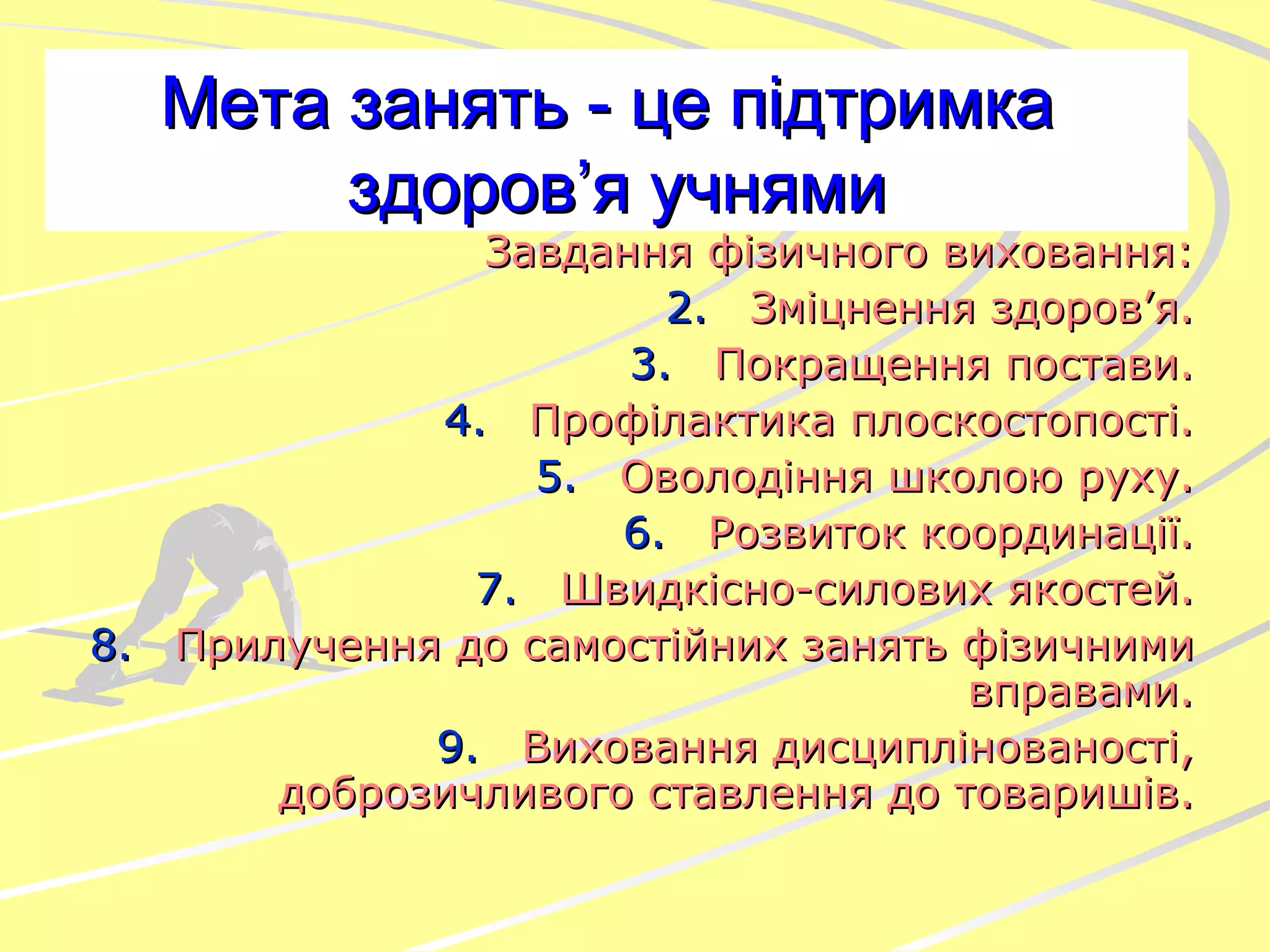 Мета занять -це підтримка здоров’я учнями Завдання фізичного виховання: Зміцнення здоров’я. Покращення постави. Профілактика плоскостопості. Оволодіння школою руху. Розвиток координації. Швидкісно-силових якостей. Прилучення до самостійних занять фізичними вправами. Виховання дисциплінованості, доброзичливого ставлення до товаришів.