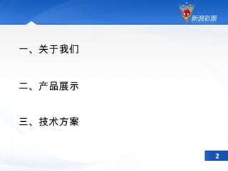 文档介绍了新浪彩票的团队、产品和目标,展示了不同彩种的产品和技术方案。包括快速登录、注册以及系统公告等功能模块,并描述了技术架构和合作平台的接入方法。