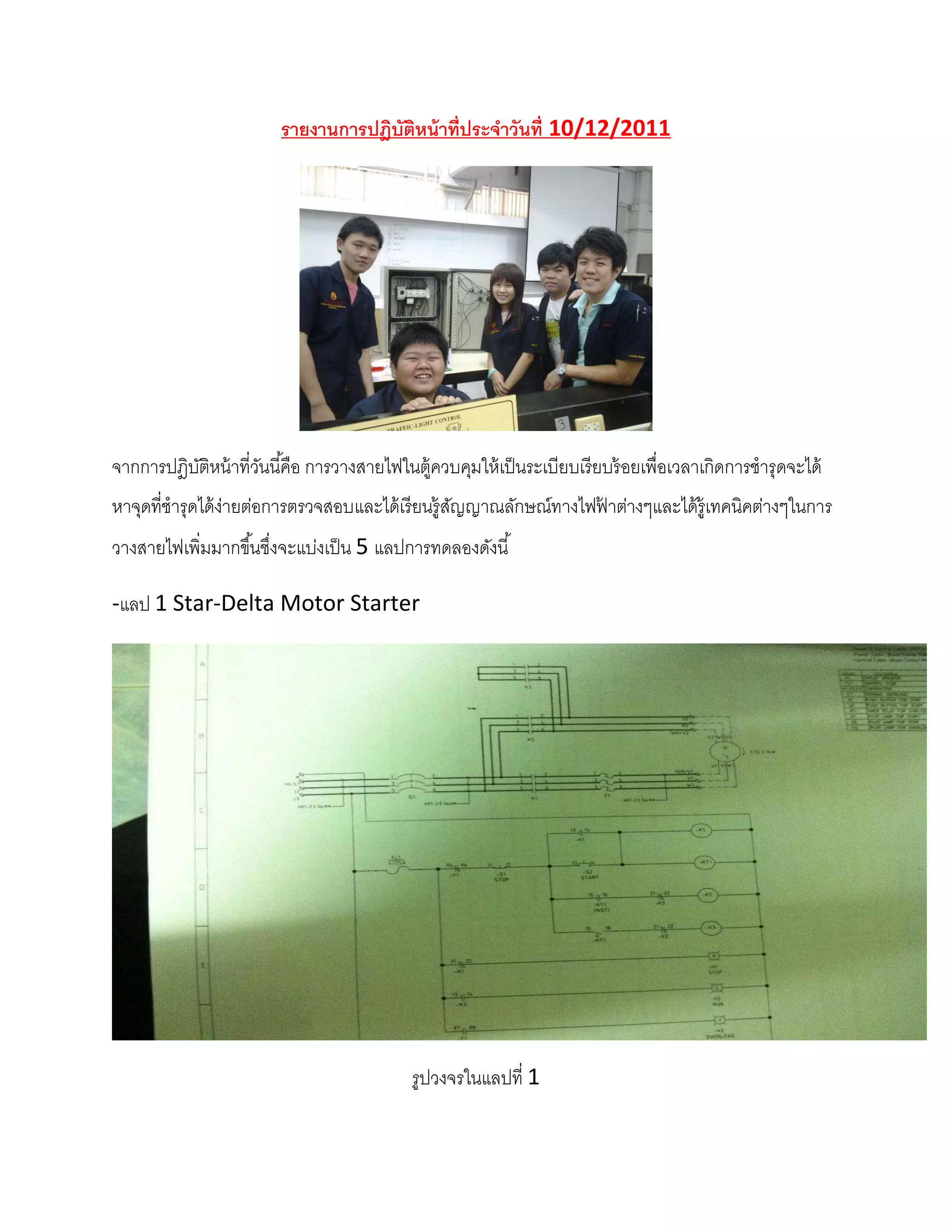 ิ จากการปฎิบติหน้ าที่วนนี ้คือ การวางสายไฟในตู้ควบคุมให้ เป็ นระเบียบเรี ยบร้ อยเพื่อเวลาเกิดการชารุดจะได้ ั ั หาจุดที่ชารุดได้ ง่ายต่อการตรวจสอบและได้ เรี ยนรู้สญญาณลักษณ์ทางไฟฟาต่างๆและได้ ร้ ูเทคนิคต่างๆในการ ั ้ วางสายไฟเพิ่มมากขึ ้นชึงจะแบ่งเป็ น 5 แลปการทดลองดังนี ้ ่ -แลป 1 Star-Delta Motor Starter รูปวงจรในแลปที่ 1