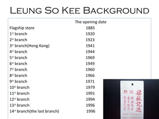 Leung So Kee is an umbrella shop that was founded in 1885 in Guangzhou, China. It opened its first branch in Hong Kong in 1920 and continued expanding, opening its 14th and final branch in 1996. The shop handmakes all of its umbrellas using traditional techniques, and it offers customers a lifetime warranty on its products and customization services for tourists. Leung So Kee faces challenges as it only has one location now in Sham Shui Po, an older area with lower consumer spending, and its products are more expensive than competitors while having an image of being outdated.