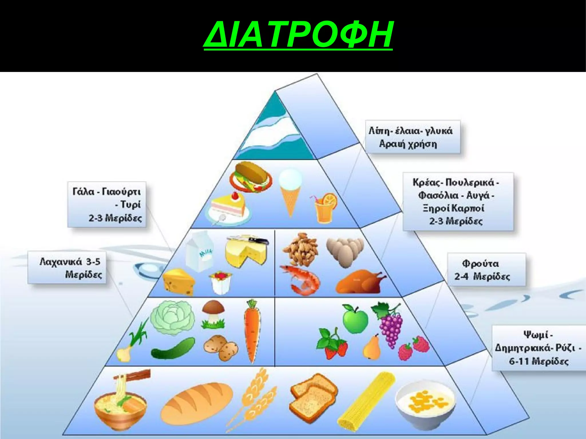 Οδηγός Διατροφής Ταφαγητά περιέχουν όλες τις θρεπτικές ουσίες τις οποίες έχει ανάγκη το σώμα μας για να μεγαλώσει, να κρατηθεί σε φόρμα ,να κινηθεί , να σκεφτεί , να διαβάσει και γενικά να ζήσει. Αυτές οι θρεπτικές ουσίες είναι οι ΠΡΩΤΕΪΝΕΣ τα ΛΙΠΗ οι ΥΔΑΤΑΝΘΡΑΚΕΣ οι ΒΙΤΑΜΙΝΕΣ τα ΑΛΑΤΑ και το ΝΕΡΟ, τα ίδια δηλαδή στοιχεία από τα οποία αποτελείται και το σώμα μας Για να έχουμε μια ισορροπημένη διατροφή πρέπει να έχουμε ποικιλία στα τρόφιμα που τρώμε και να διαλέγουμε τη σωστή ποσότητα για να είμαστε σίγουροι ότι παίρνουμε τις θρεπτικές ουσίες που χρειαζόμαστε. Από τα τρόφιμα παίρνουμε τα «καύσιμα» που χρειάζεται ο οργανισμός για να κάνει τις λειτουργίες του (να χτυπήσει η καρδιά, να αναπνεύσω, να πάω σχολείο κτλ).
