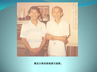 黃田方是一位書畫藝術家,他在1992年至2011年間參與了多個書法展覽和講座,並與國際學生交流書法技藝。文檔詳細記錄了他的展覽、活動及與其他書法藝術家的合作。黃田方對促進書法藝術在馬來西亞及國際間的發展做出了貢獻。