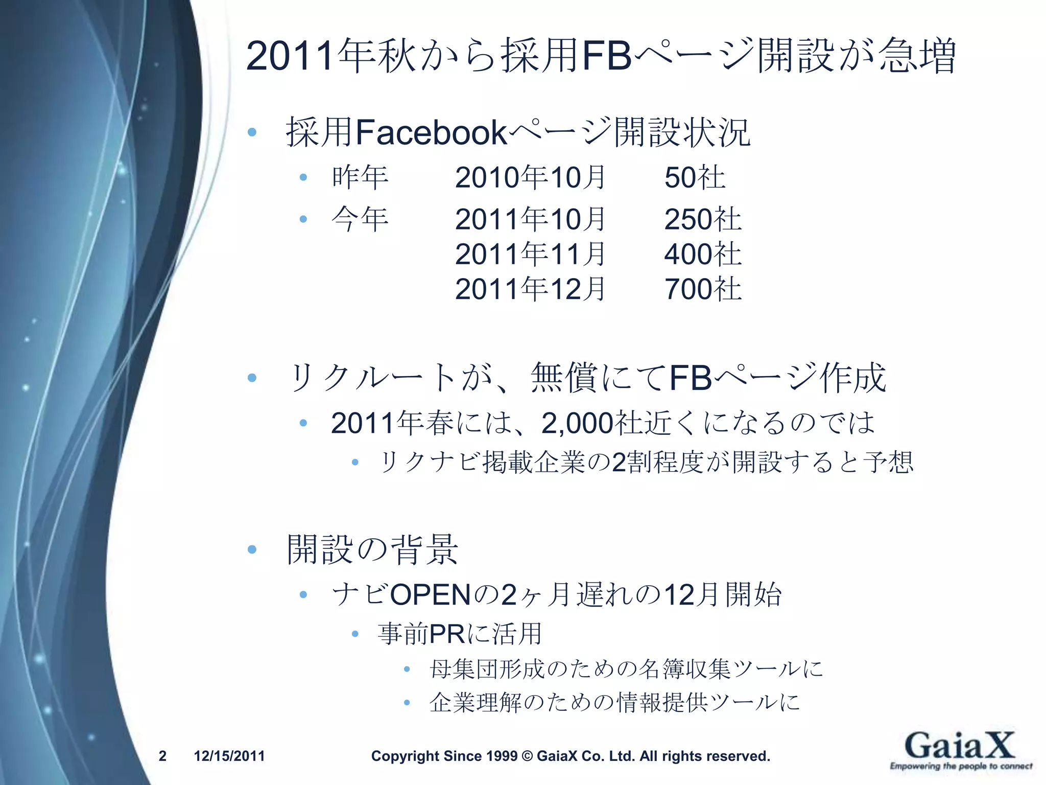 • 採用Facebookページ開設状況 • 昨年 2010年10月 50社 • 今年 2011年10月 250社 2011年11月 400社 2011年12月 700社 • リクルートが、無償にてFBページ作成 • 2011年春には、2,000社近くになるのでは • リクナビ掲載企業の2割程度が開設すると予想 • 開設の背景 • ナビOPENの2ヶ月遅れの12月開始 • 事前PRに活用 • 母集団形成のための名簿収集ツールに • 企業理解のための情報提供ツールに 2 12/15/2011 Copyright Since 1999 © GaiaX Co. Ltd. All rights reserved.