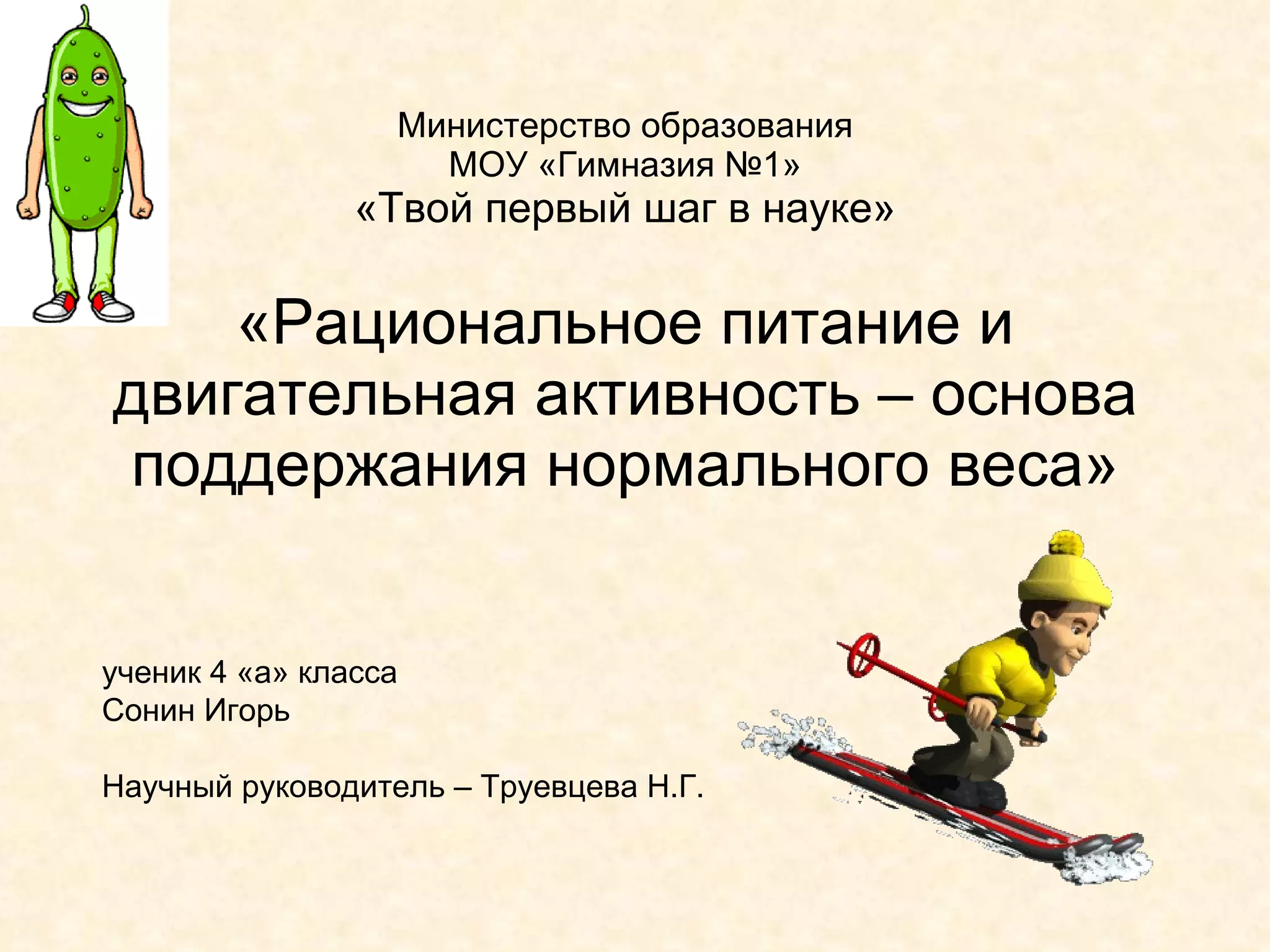 Документ представляет исследование ученика о рациональном питании и физической активности для поддержания нормального веса. Участник анализа выделяет свои физические нагрузки, калорийность различных блюд и рекомендует увеличение двигательной активности и снижение доли высококалорийной пищи. Цель исследования - обоснование необходимости соблюдения норм питания и физической активности для контроля веса.
