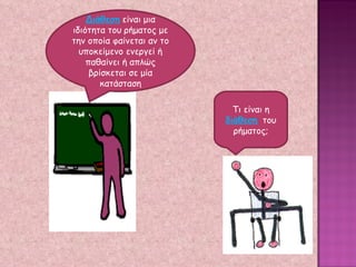 Τι είναι η διάθεση του ρήματος; Διάθεση είναι μια ιδιότητα του ρήματος με την οποία φαίνεται αν το υποκείμενο ενεργεί ή παθαίνει ή απλώς βρίσκεται σε μία κατάσταση